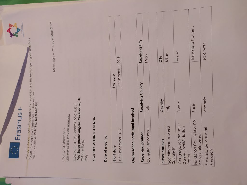 El 12 y 13 de diciembre de 2019, el director de nuestra entidad Luis Bononato y nuestra compañera Nuria Alcón, viajaron hasta Milán (Italia) para tener la primera reunión con el equipo que va a desarrollar el proyecto europeo de ERASMUS + denominado «VO.ICE para la Inclusión, Ciudadanía y Empoderamiento» coordinado por la Asociación Consulta Diocesana para las actividades en favor de los niños y las familias de Génova (Italia).